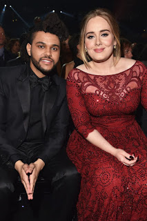 | The Weeknd looks like he asked somebody to quick take a picture with Adele and she's just waiting for this whole thing to end because she's got to get on a plane again in three hours. |